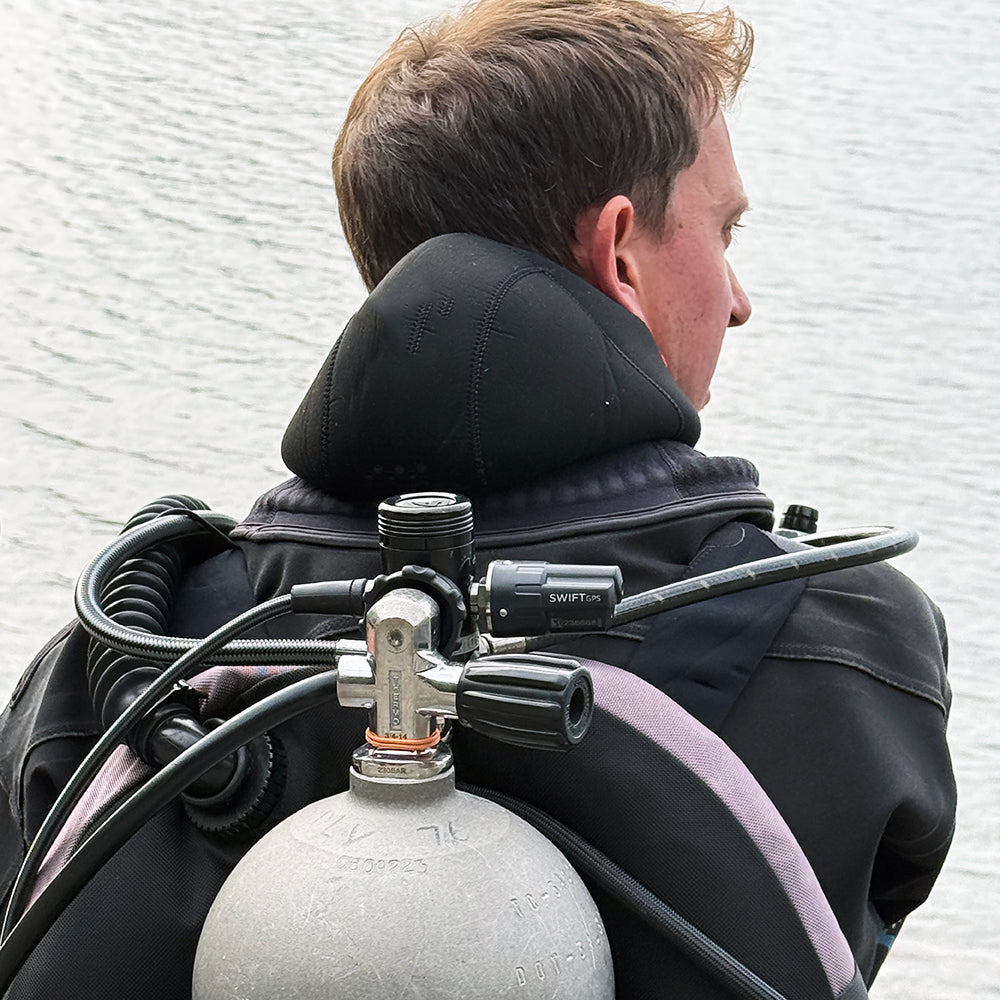 The Swift GPS uses a multi-constellation Global Navigation Satellite System (GNSS) receiver that determines location from GPS, Galileo and BeiDou satellites. The location information can be shared with your buddy or a boat full of divers. Any Shearwater air-integrated computer within range can pick up the Swift GPS signal.*